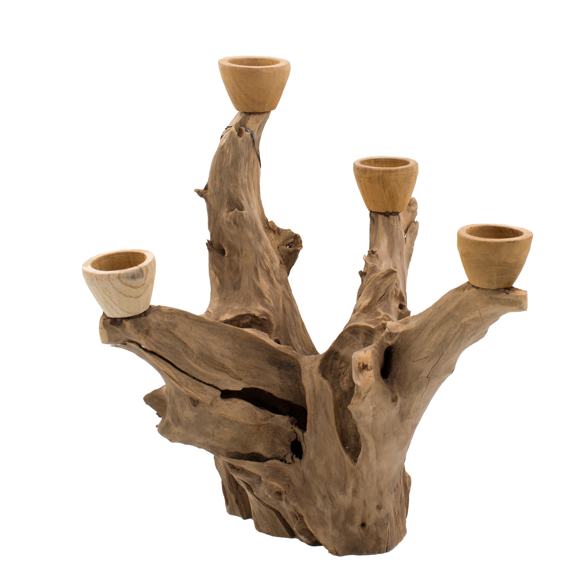 Teak wood candelabra, holds 4 candles. One of a kind item, variation between items to be expected.